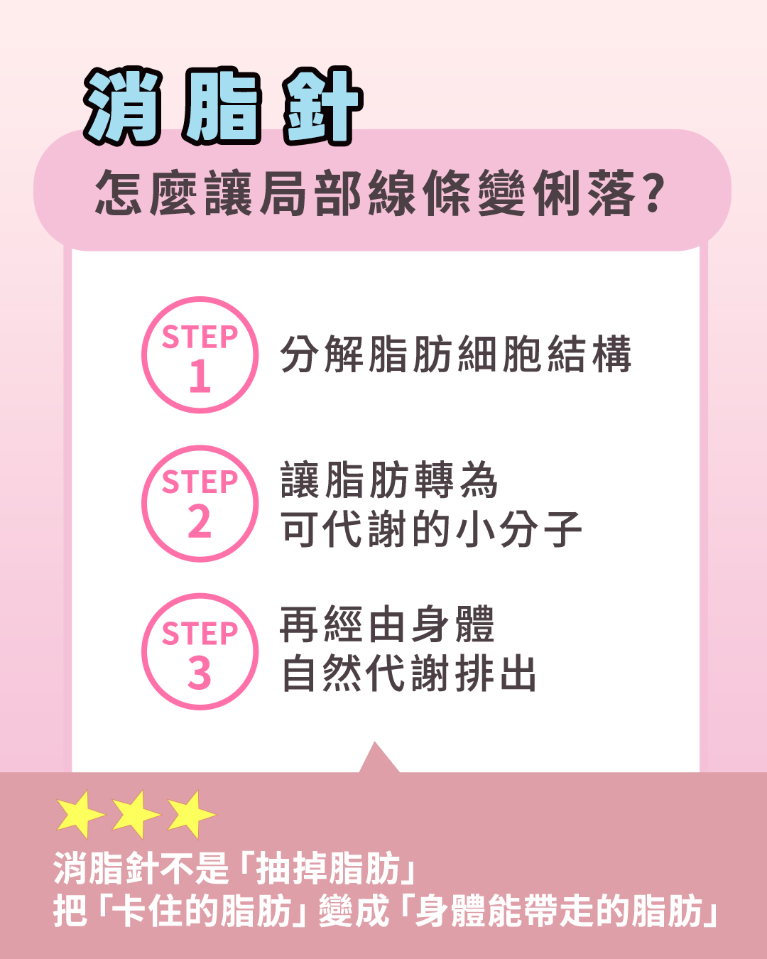 許多人會誤以為消脂針是「把脂肪抽掉」,其實並非如此。