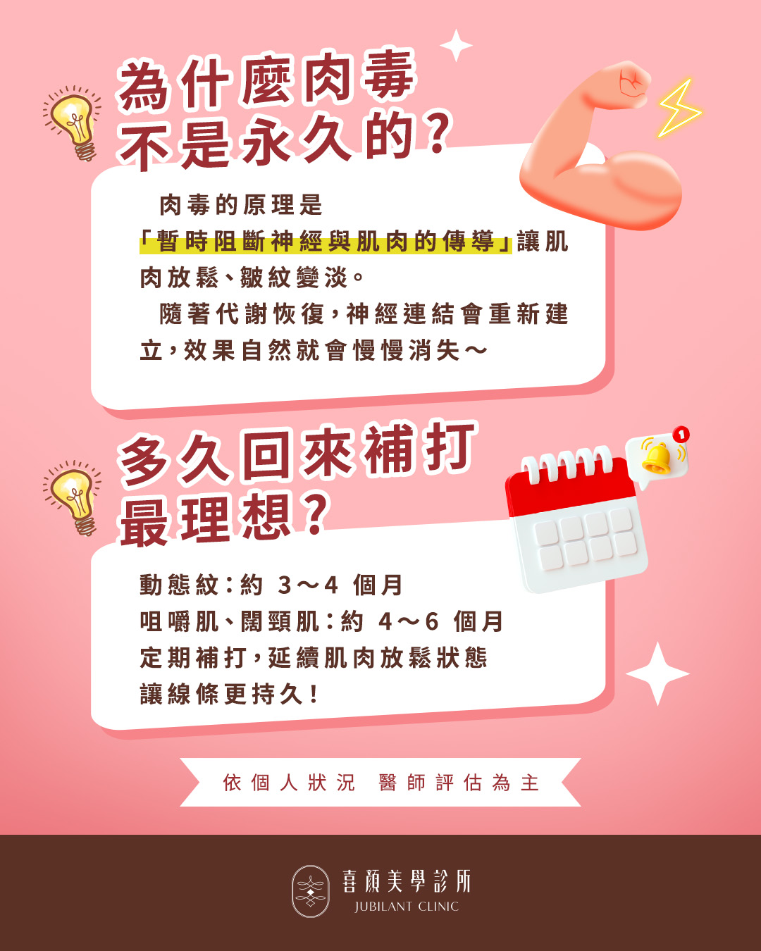 但仍會因個人體質、代謝速度、施打部位與劑量等因素而有所差異。當神經傳導逐漸恢復後,肌肉活動力也會慢慢回到原本狀態,紋路或線條自然會再次顯現。
