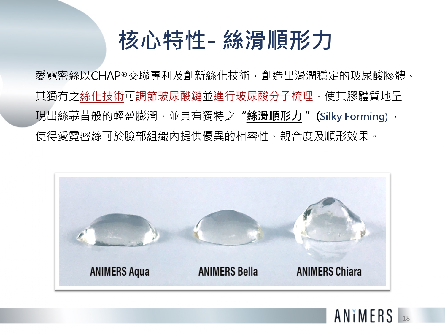 愛霓密絲以CHAPR交聯專利及創新絲化技術,創造出滑潤穩定的玻尿酸膠體。