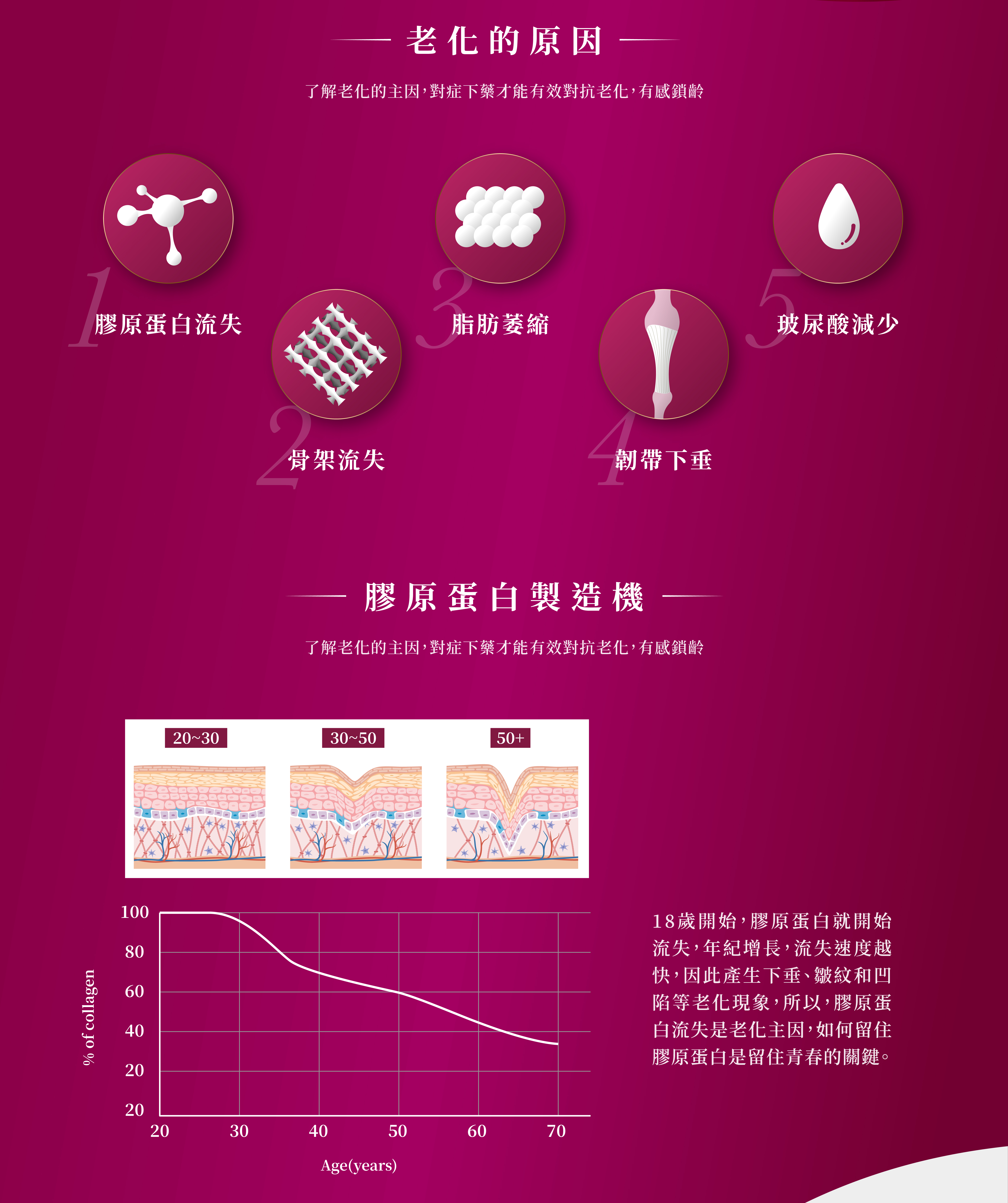 老化不只是表面的皺紋,其核心在於膠原蛋白的流失。 人體從18 歲開始,膠原蛋白便以不可逆的速度逐漸遞減。隨著支撐力減弱,皮膚會出現下垂、凹陷與深刻的紋路。因此,減緩流失並重啟「自體增生」,是維持臉部彈性與年輕輪廓的關鍵。