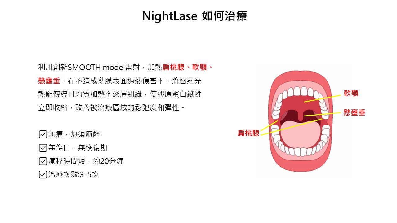 A:打鼾成因眾多,NightLase® 主要針對「軟組織鬆弛」引起的鼾聲進行優化。建議由專業醫師評估您的氣道結構,判斷是否適合此項療程。