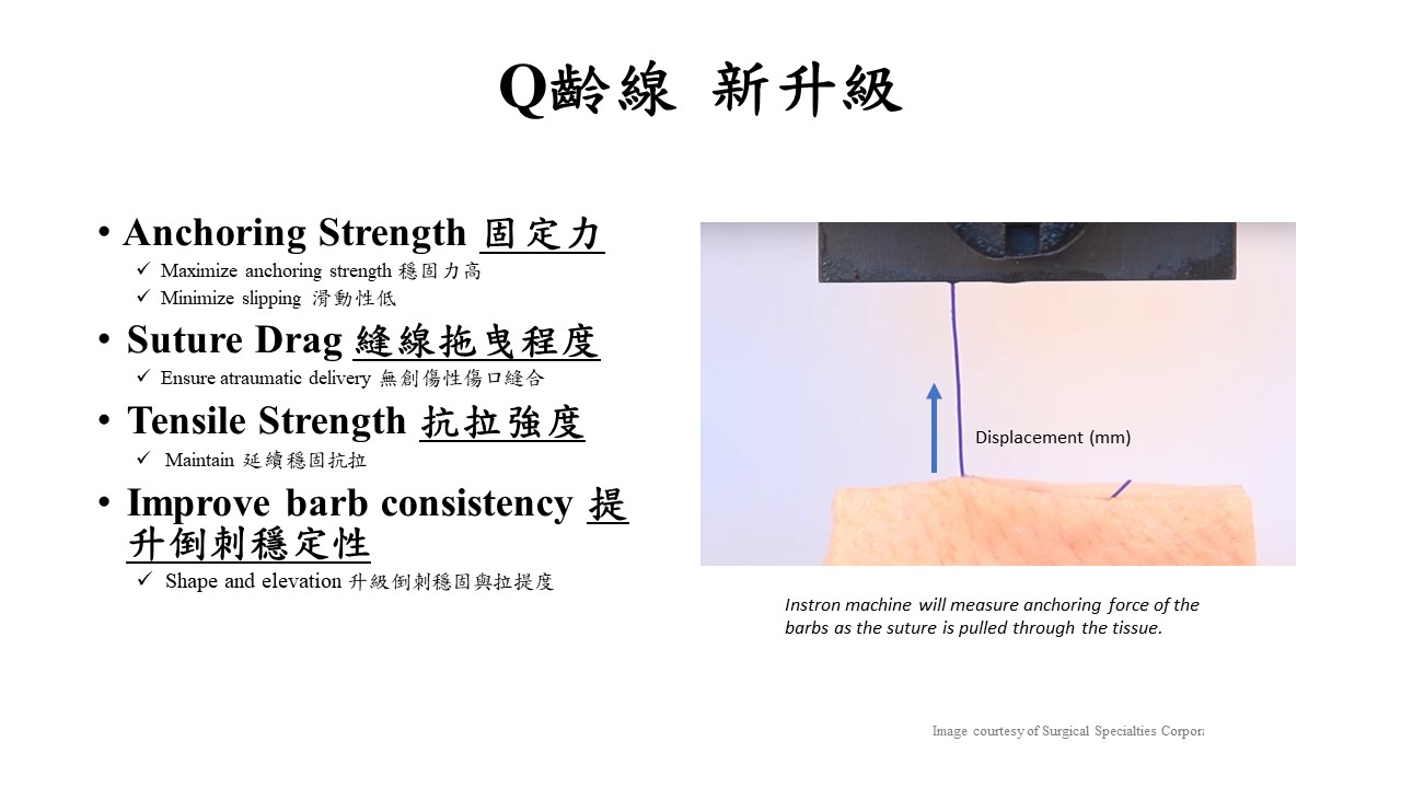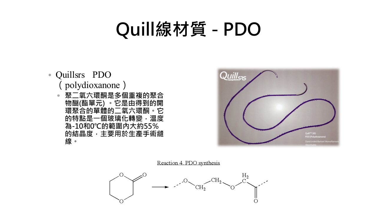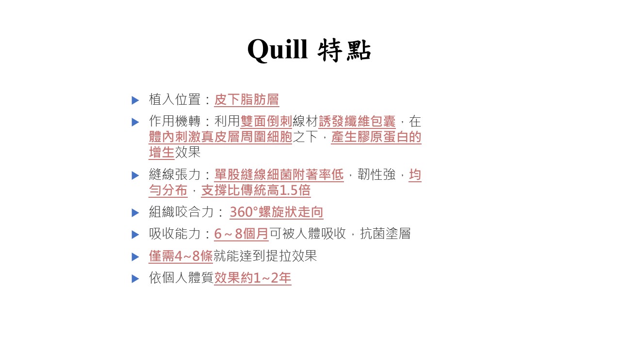 新一代「QUILL羽毛線」使用可吸收PDO縫線,不需拆線,植入6至8個月後會逐漸被人體吸收,沒有材質滯留的缺點,安全性更高。
