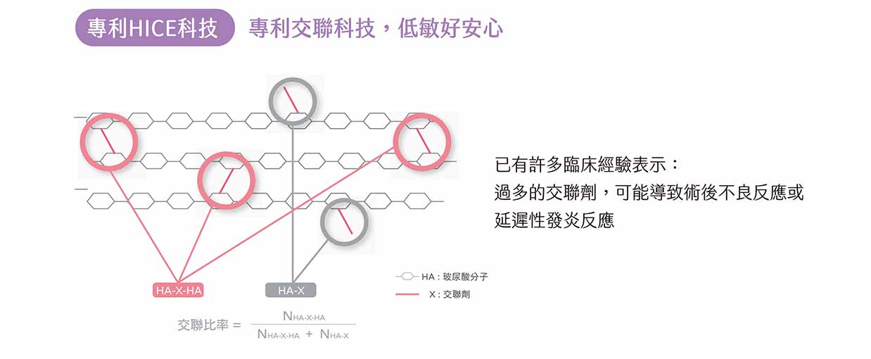 專利 HICE 交聯科技: 透過高端交聯技術,大幅降低化學添加殘留。不僅過敏風險低,更能讓妳美得好安心。