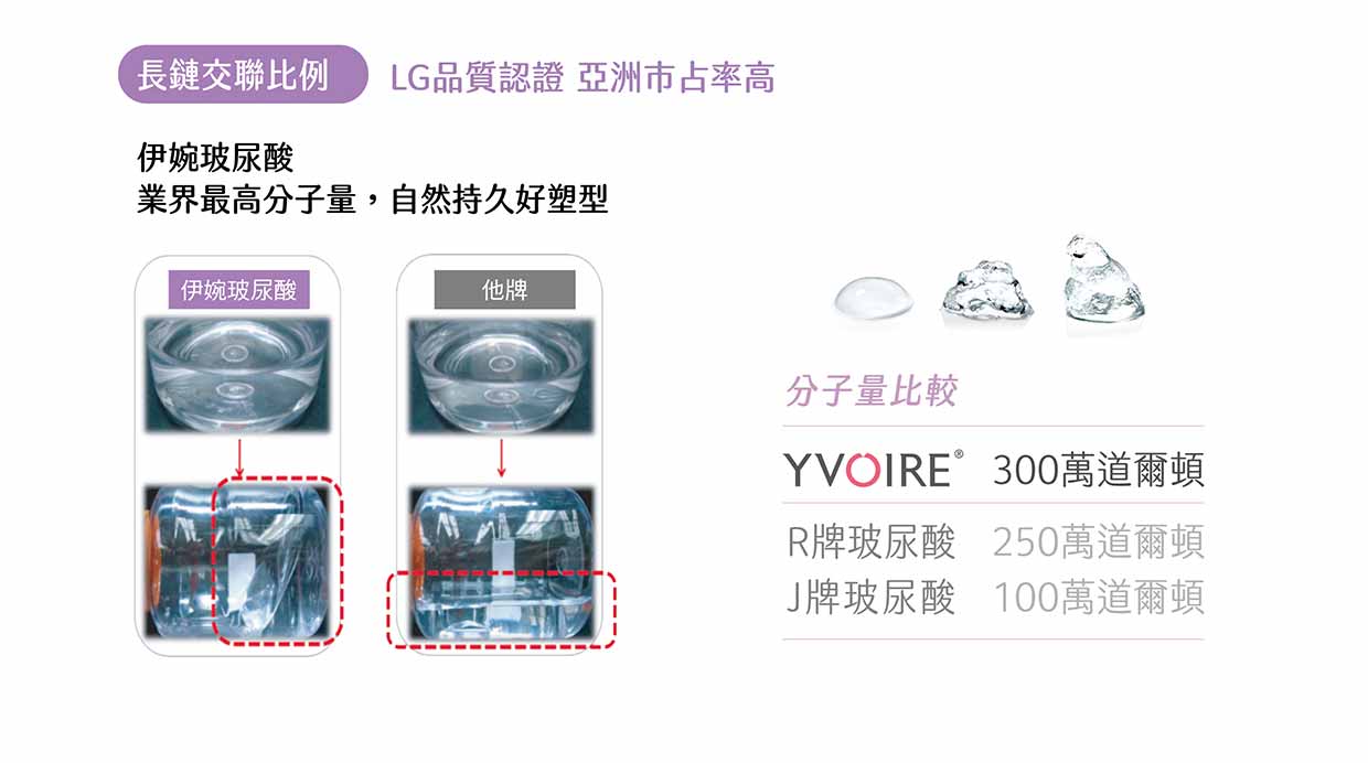 LG 品質認證: 由韓國 LG 化學研發,擁有極高的長鏈交聯比例,支撐結構更穩固,這也是為什麼它能在亞洲醫美市場擁有極高市佔率的原因。