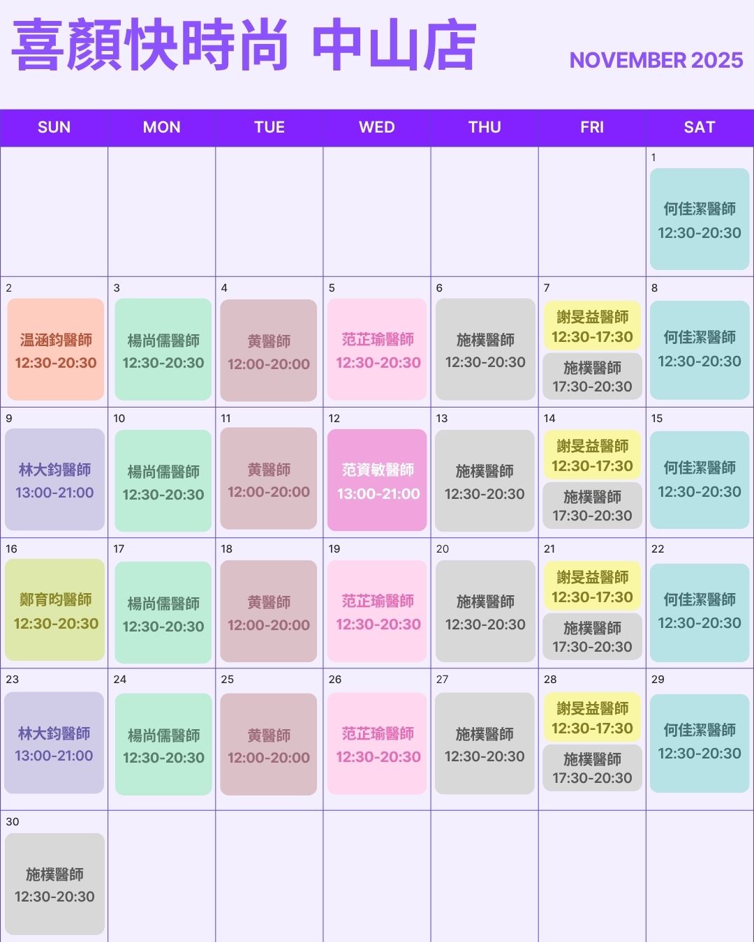 喜顏快時尚診所(中山店)門診時間