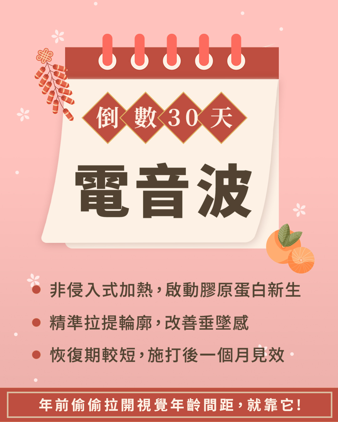 - 為何選在 30 天前? 電音波的效果會隨時間遞增,通常在施作後一個月效果最為顯著。提前安排,讓輪廓在過年前「悄悄歸位」,展現自然且飽滿的年輕感。