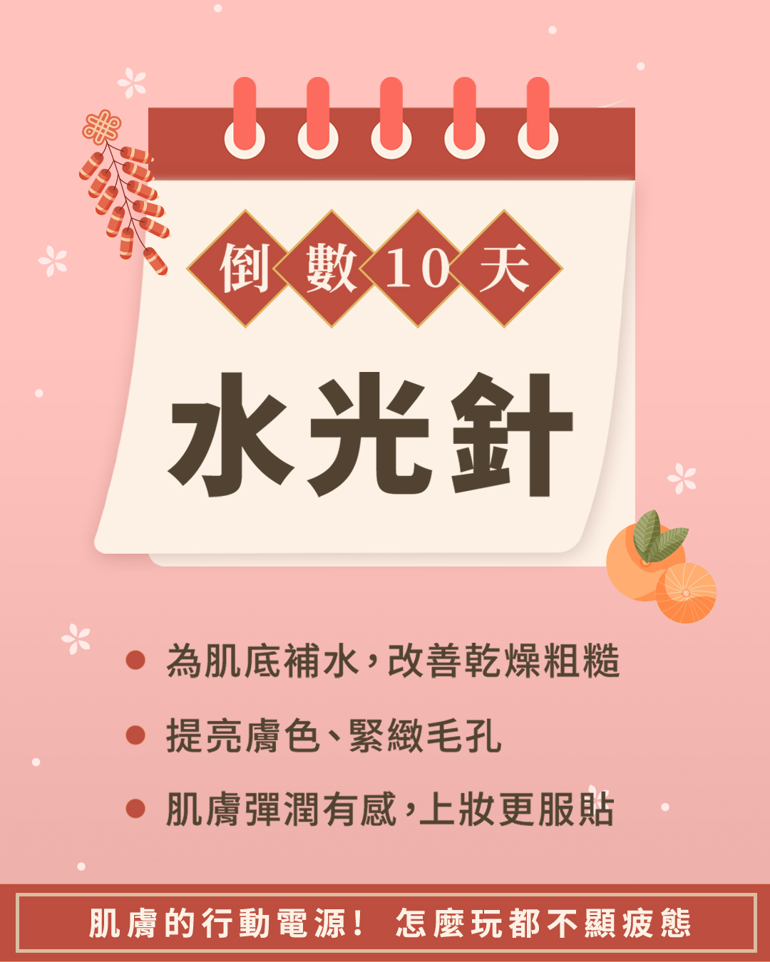 乾燥與粗糙是視覺年齡的大敵。在重要節日前 10 天,建議透過水光針為肌膚深度鎖水。