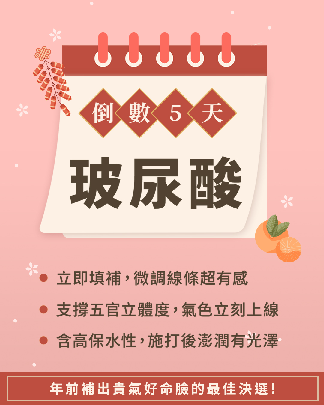 - 新春應用: 透過專業醫師的精細施打,能改善臉部疲憊感,讓您在過年期間自帶澎潤好氣色,隨手拍照都立體有感。