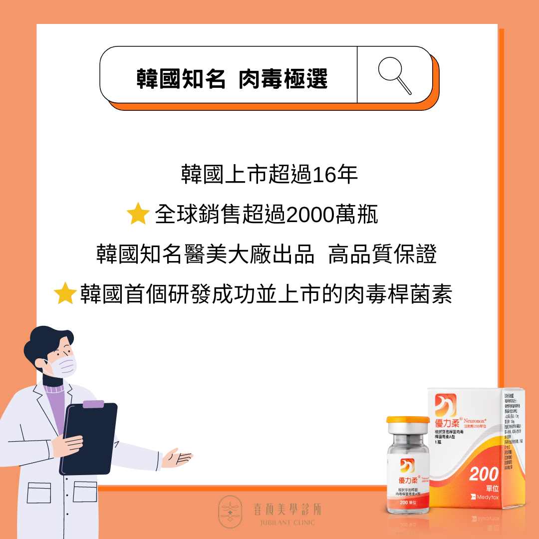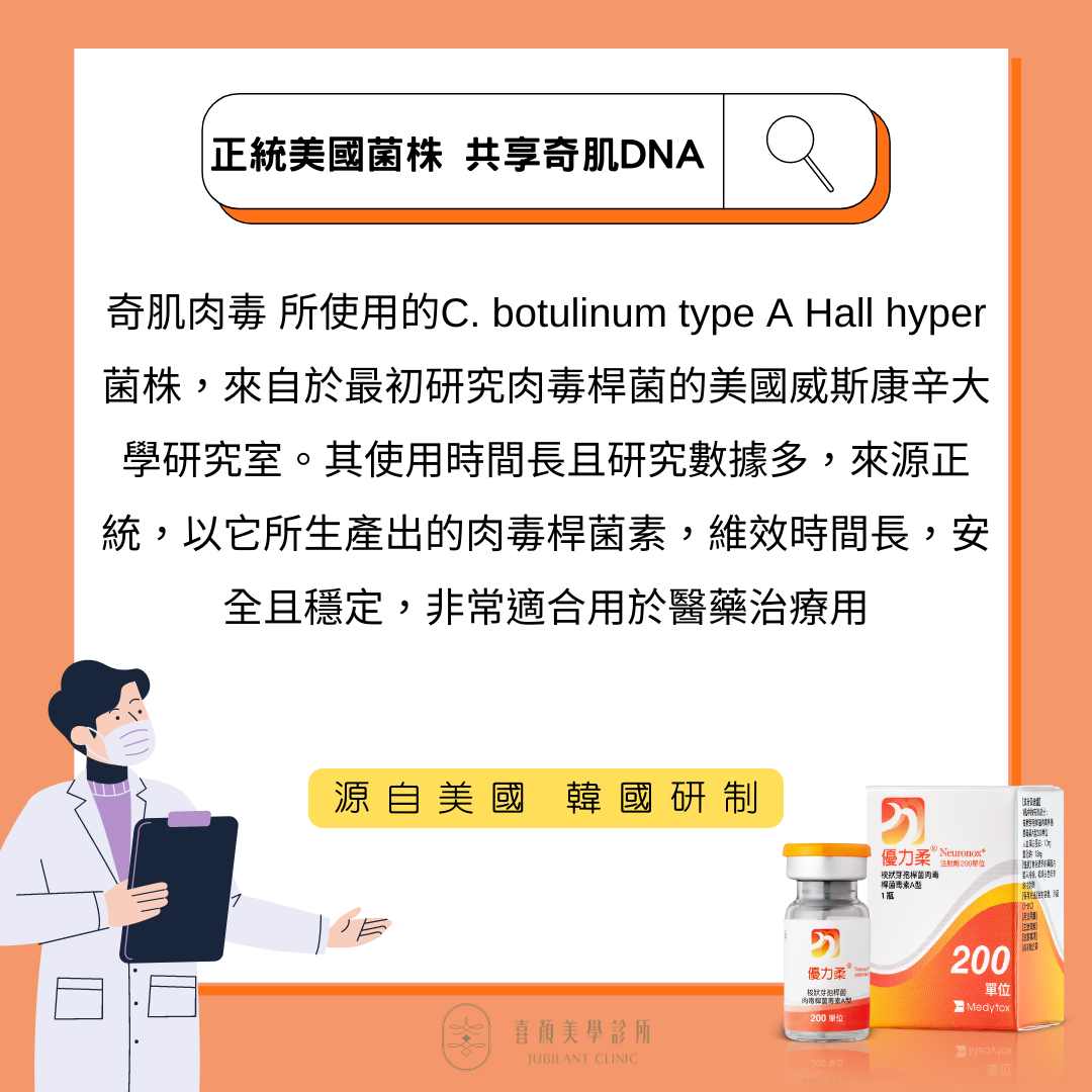 來源正統,以它所生產出的肉毒桿菌素,維效時間長,安全且穩定,非常適合用於醫藥治療用