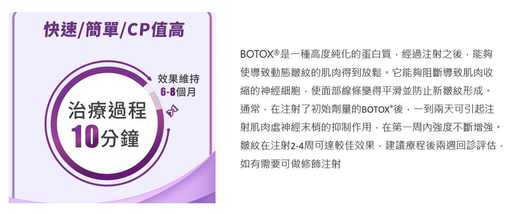 - 維持時間: 最佳效果約出現在術後 1 至 2 個月,整體維持期約 4 至 6 個月。效果會受個人體質、生活習慣及表情使用頻率影響。